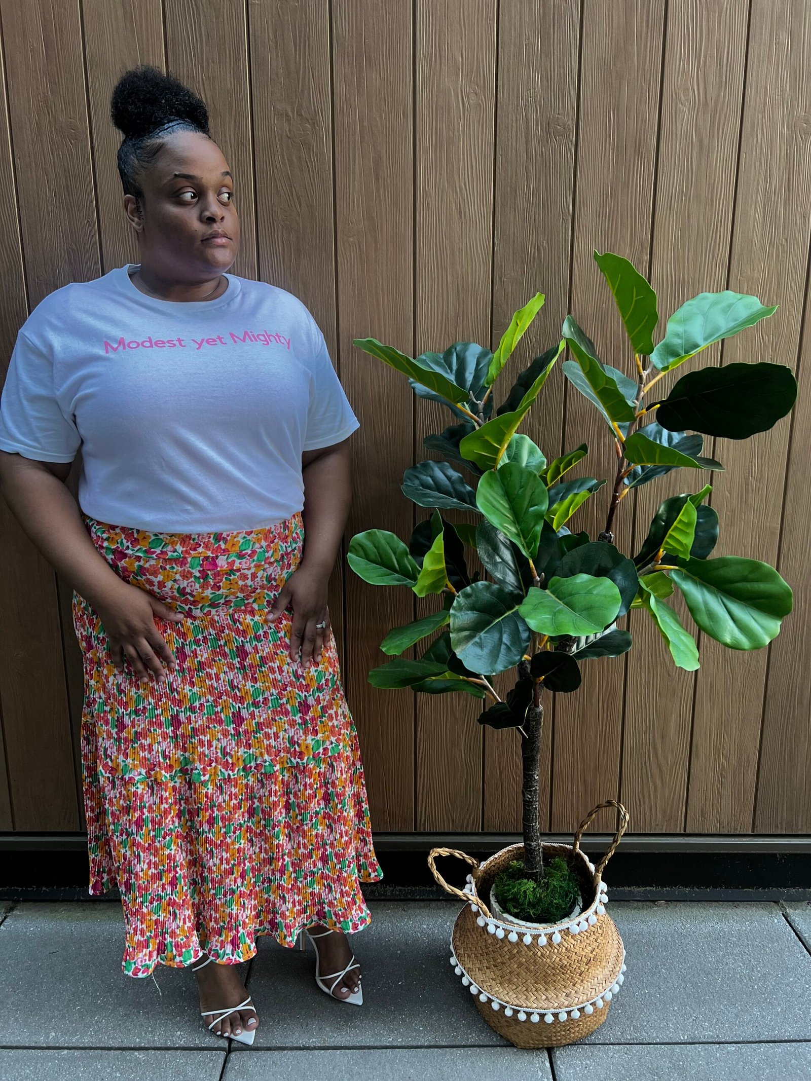 Empower your wardrobe with our ‘Modest Yet Mighty t-shirt-a perfect blend of confidence and grace. Crafted from soft, high-quality fabric, this short-sleeve tee is designed for women who embrace modesty as their strength. Its bold lettering and versatile style make it ideal for any casual outfit paired nicely with a skirt or layered under a blazer. Wear your values proud with this must-have tee!